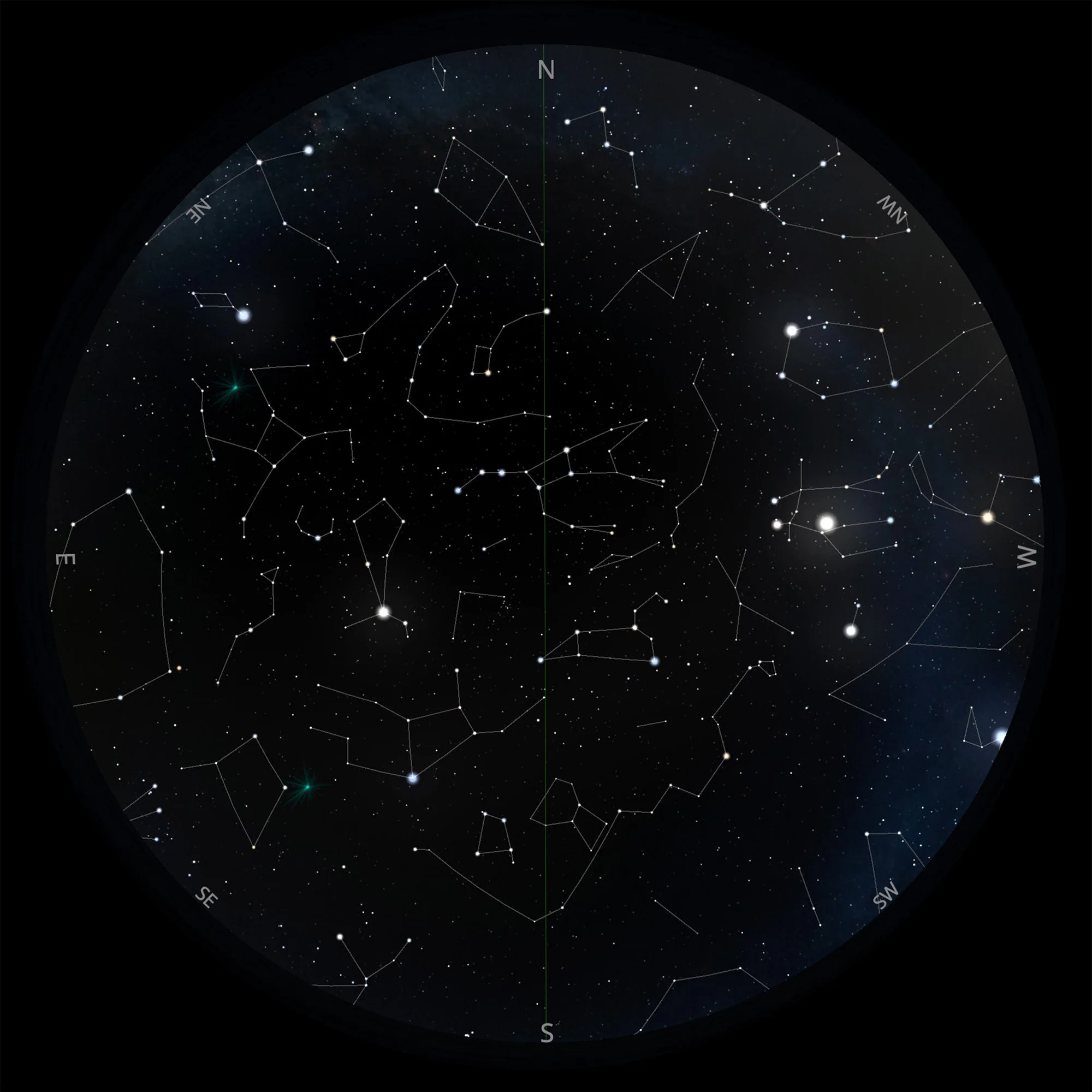In the northern hemisphere, Leo and Virgo carry the last of the Virgo Cluster galaxies across the southern sky. Overhead, Canes Venatici and Coma Berenices are ideally placed — the heart of galaxy season. Ursa Major sits high, putting M101 near the zenith. Boötes is rising in the east.