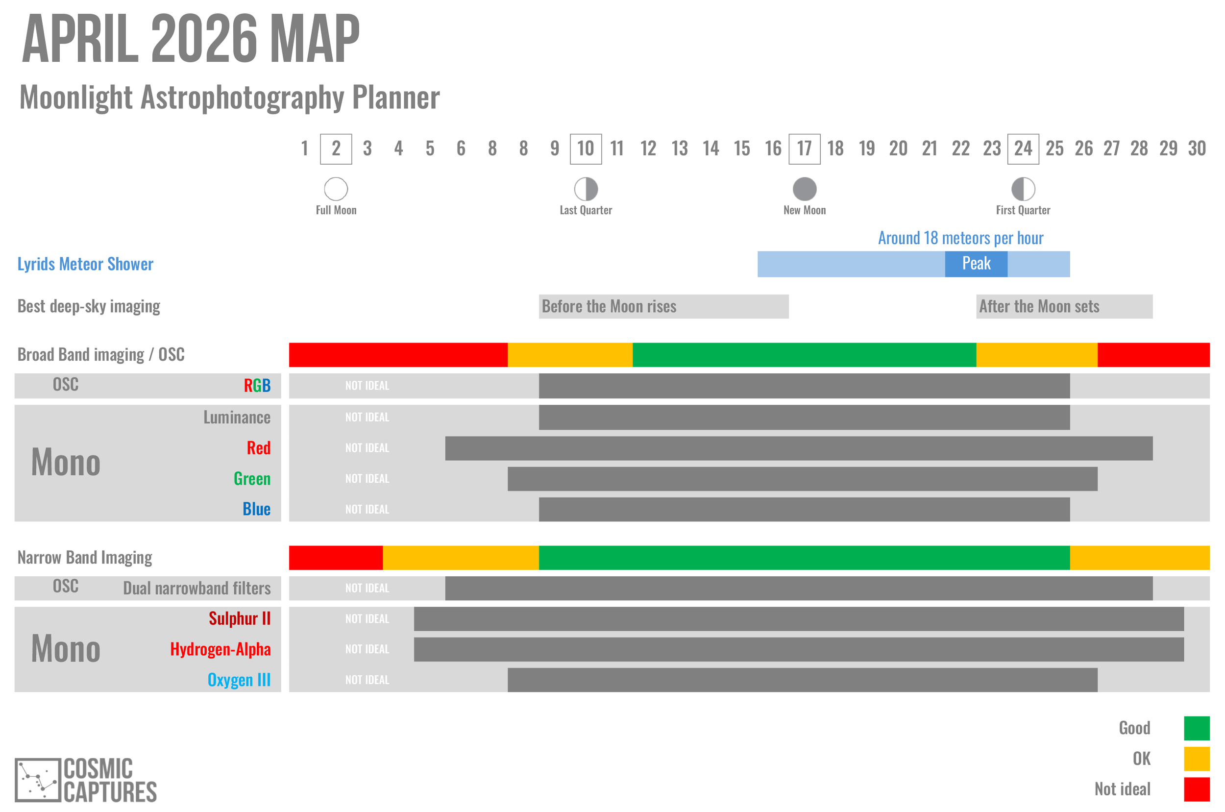 Each month, the MAP — or Moonlight Astrophotography Planner — helps you choose the best nights for capturing galaxies, nebulae, and nightscapes. Whether you’re shooting broadband or narrowband, MAP gives you clear guidance based on the Moon phase, so you can match your imaging plans to the sky conditions.
