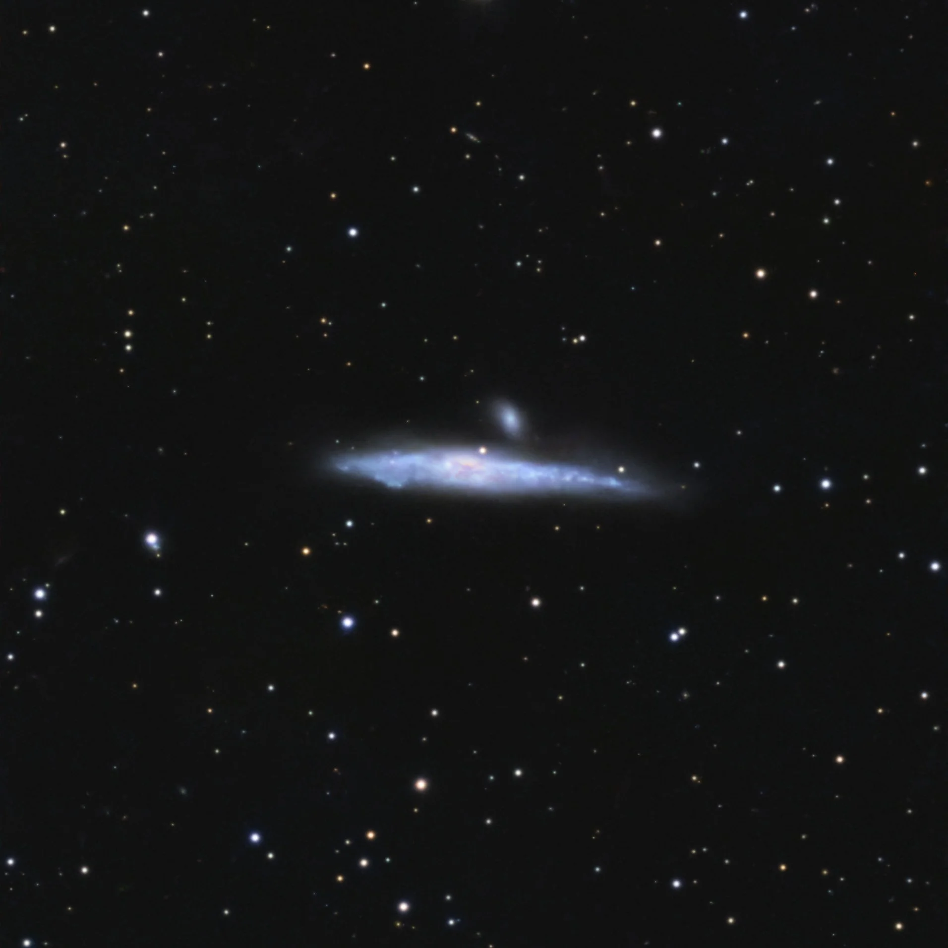 The Whale Galaxy earns its name — long, slightly curved, blue with star formation along the spine. The small companion NGC4627 sits just above it like a remora fish that forgot to let go. Edge-on galaxies are often dramatic but flat; NGC4631 has texture, colour, and structure that keeps drawing the eye back. A suburban sky target that delivers more than it promises.