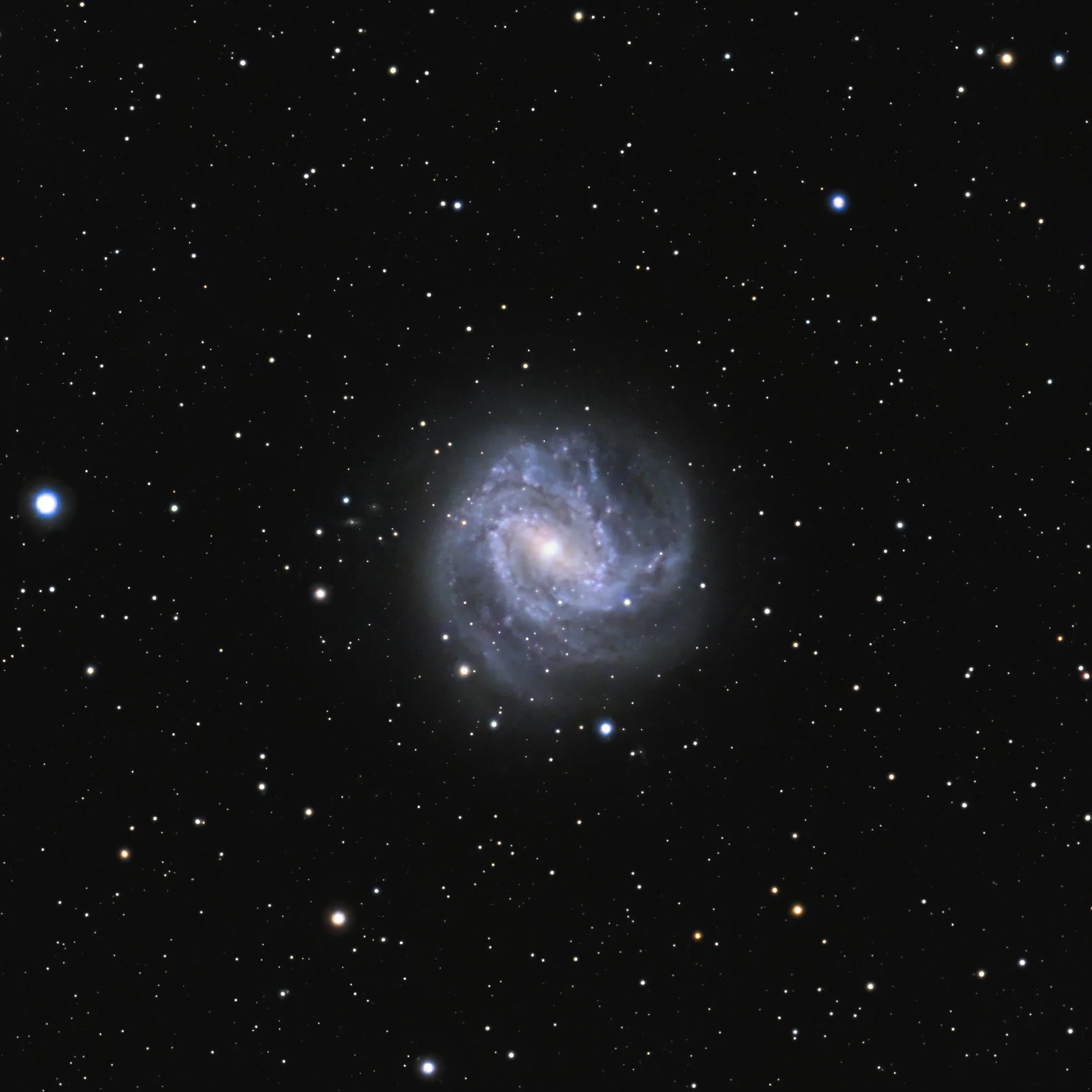 One of the closest spiral galaxies in the sky — and one of the most rewarding to image. The bar structure is unmistakable, the spiral arms reach wide, and those blue star-forming knots along the arms are visible even on a smart telescope. Face-on and generous, M83 gives you everything: structure, colour, depth. From a suburban sky with a couple of hours of integration, this is as good as galaxy season gets.