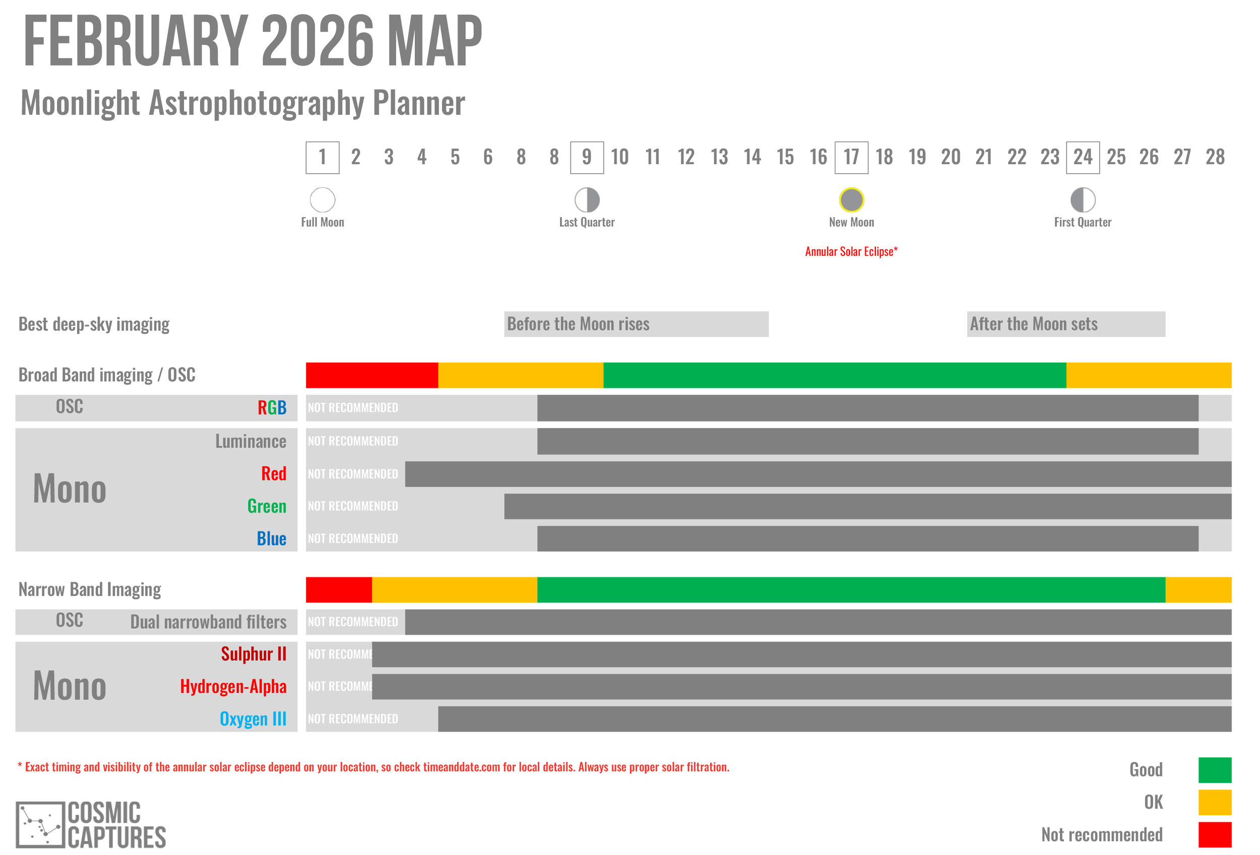 Each month, the MAP — or Moonlight Astrophotography Planner — helps you choose the best nights for capturing galaxies, nebulae, and nightscapes. Whether you’re shooting broadband or narrowband, MAP gives you clear guidance based on the Moon phase, so you can match your imaging plans to the sky conditions.