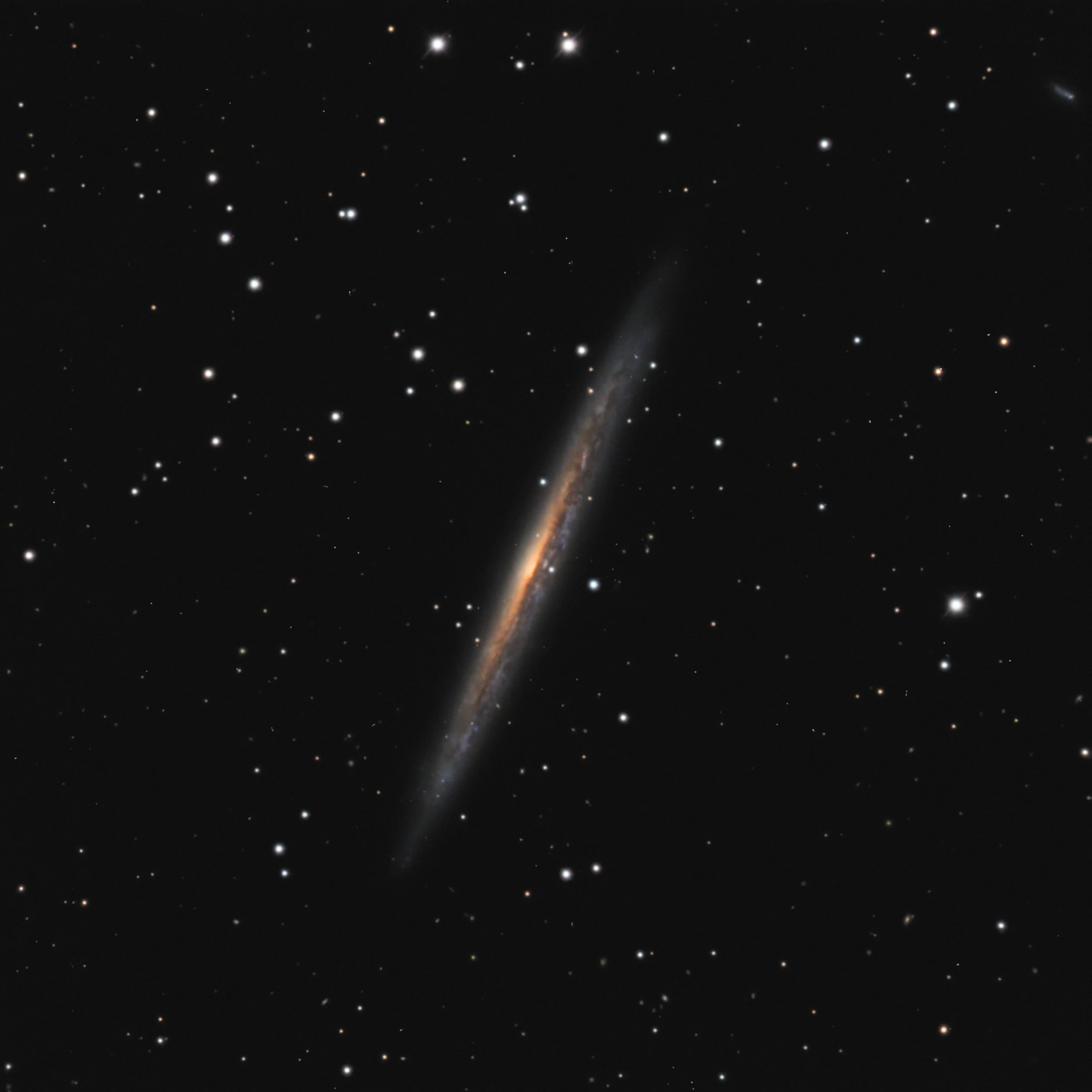 The elongated sliver is visible from the start, but the dust lane and faint outer halo only emerge with serious integration. A patient target — give it 4 hours or more if your sky allows.