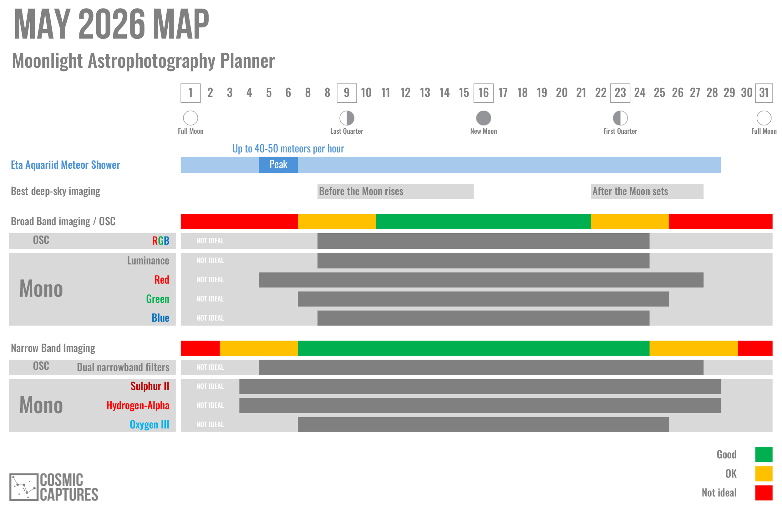 Each month, the MAP — or Moonlight Astrophotography Planner — helps you choose the best nights for capturing galaxies, nebulae, and nightscapes. Whether you’re shooting broadband or narrowband, MAP gives you clear guidance based on the Moon phase, so you can match your imaging plans to the sky conditions.