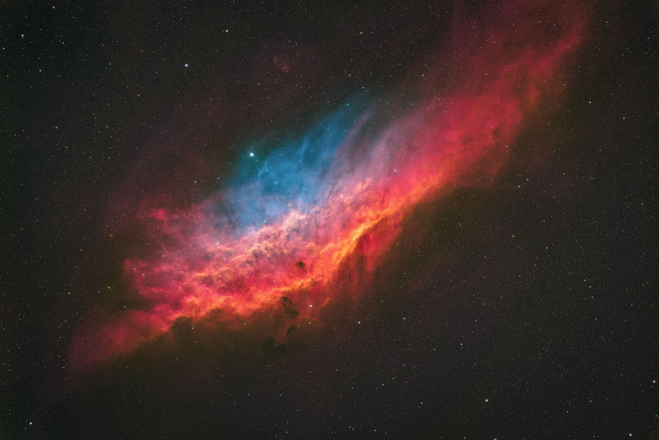 Because its glow is dominated by H-alpha, the California Nebula often appears as a monochrome streak of deep red in most images. However, it also emits in sulfur-II (S-II) and faintly in oxygen-III (O-III). These reveal themselves only through long, patient integrations but capturing these emissions with narrowband techniques allows astrophotographers to create a far more colourful and dynamic portrait of this vast region.